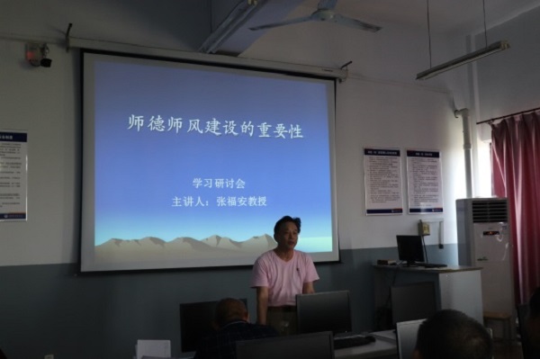 张福安教授从自身经历出发,讲解了教师这个职业的特点,教师作为文化的传播者,担负着培养适应社会主义现代化建设要求的一代又一代有理想、有道德、有文化、有纪律的公民的艰巨任务,要求每个教师都要树立起献身教育,教书育人的信念和决心。