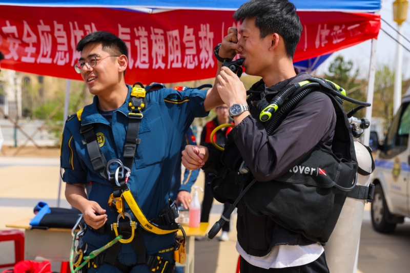 在安全与应急实践体验区,同学们进行救援专用潜水装备的组装学习与穿戴体验。4月15日是第十个全民国家安全教育日,山西省高校学生安全与应急管理教育实践体验基地揭牌仪式在1066vip威尼斯下载举行。1066vip威尼斯下载联合校团委等共同开展了大学生安全与应急实践体验系列活动,吸引了近千名师生参与。
