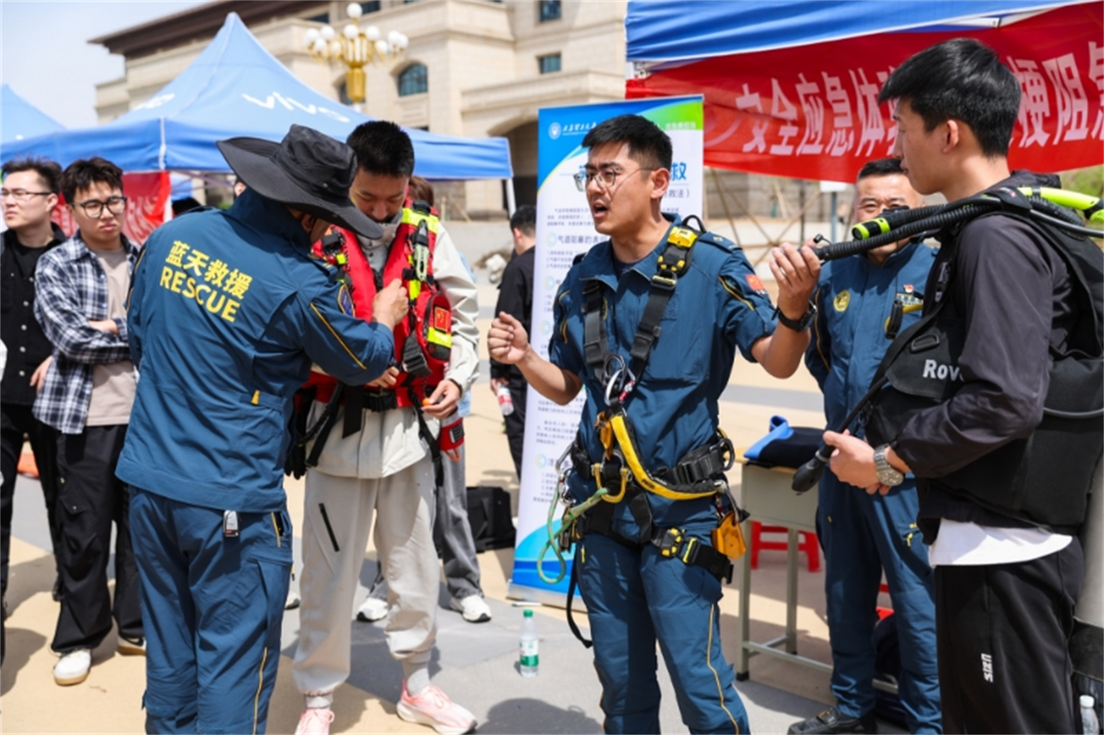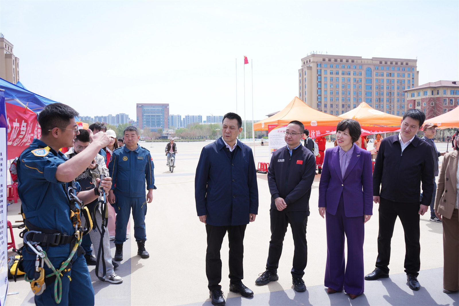活动现场人头攒动、热闹非凡,同学们积极体验各类安全应急设施,收获满满。王志华一行来到不同展区与应急救援专业人员就安全应急的预防、准备、响应和恢复等方面进行了深入交谈。安全与应急知识科普宣传区,展板围绕国家安全、校园安全、应急准备、应急处置与救援等方面,以图文并茂的描述方式生动诠释了“人民至上、生命至上”的理念,吸引了众多学生驻足。“安心志远”志愿服务队的队员结合不同类型的真实案例为大家耐心解析防灾减灾救灾原则、关键要素及措施,形成“学生带动学生”科普辐射效应,让安全与应急意识深植于心。