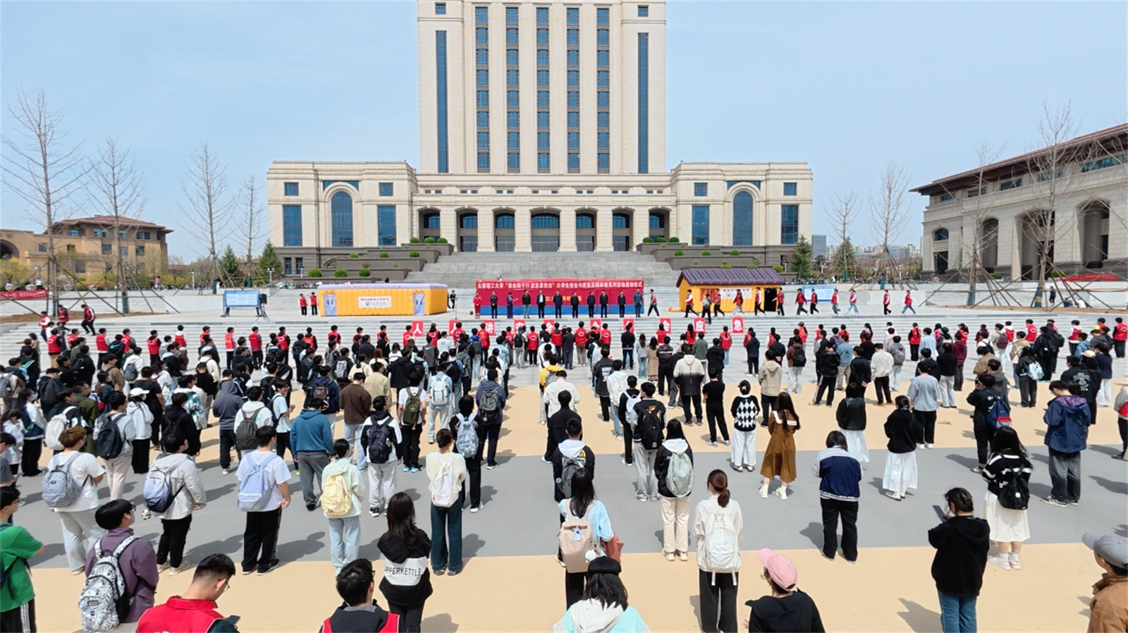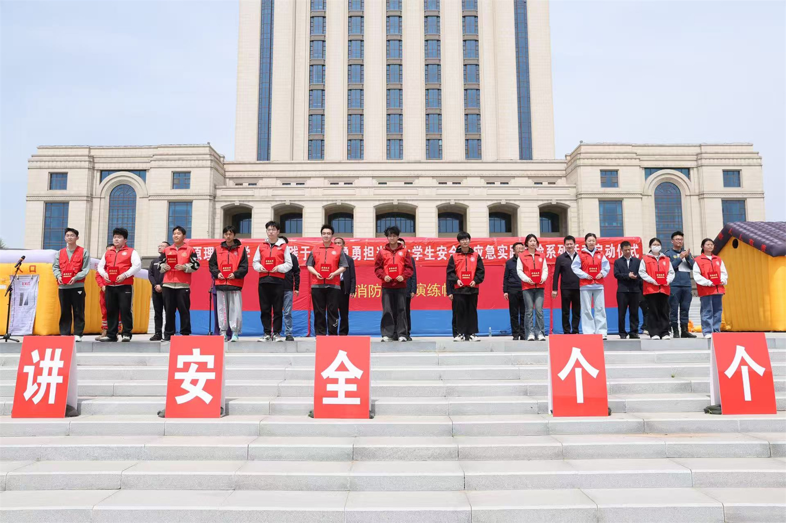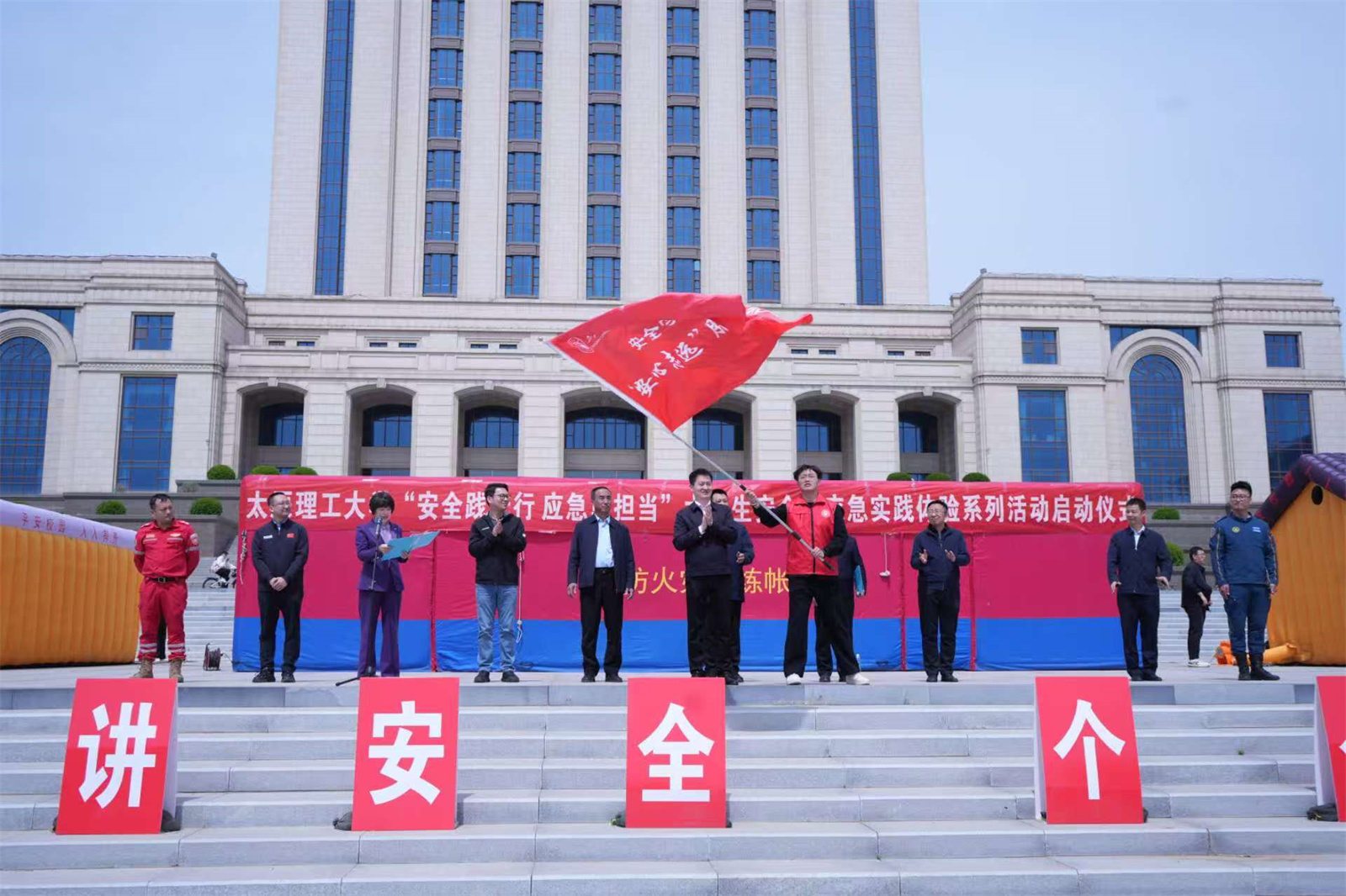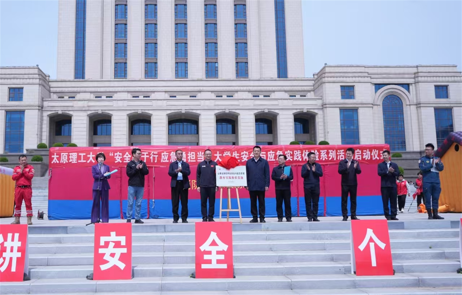 4月15日,在第十个“4.15”全民国家安全教育日到来之际,“山西省高校学生安全与应急管理教育实践体验基地”揭牌仪式在我校明向校区举行。1066vip威尼斯下载联合校安全保卫部、学生工作部、校团委在图书馆南广场共同开展了大学生安全与应急实践体验系列活动,为全校师生打造沉浸式安全素养提升平台,吸引了近千名师生参与。校党委常委、副校长王志华出席启动仪式并讲话。学校相关部门(单位)负责人,山西虹安科技股份有限公司、太原市小店区蓝天应急救援队、北京螭吻公共安全(校园安全)应急实践体验基地等负责人参加。启动仪式由1066vip威尼斯下载党委书记李平主持。