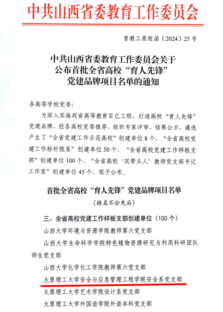 近年来,安全系党支部带领全体党员深入学习贯彻习近平新时代中国特色社会主义思想和党的二十大精神,牢记“为党育人 为国育才”初心使命,以党建引领“五个聚焦”为工作思路,不断推进党支部工作创新工程,躬耕育人、潜心科研,全面提升了党员队伍的凝聚力和战斗力。支部先后被学校评为“五星级党组织”、获批山西省高校首批“双带头人”教师党支部书记工作室、被学校评为“先进基层党组织”。